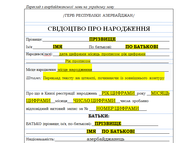 Шаблон перекладу свідоцтва про народження з азербайджанської мови на українську мову